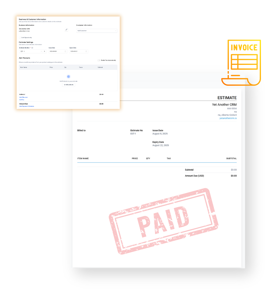 Send professional invoices and estimates in just a few clicks with YAC. Create, customize, and share them directly with clients, no extra software needed. Track approvals, payments, charge recurring, and get status updates all in one place, so you get paid faster and stay organized effortlessly.
